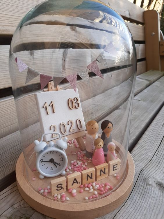 - Voeg foto’s van de baby of de ouders toe in de stolp, samen met het speelgoed of beeldje en de takjes of kunstbloemen.